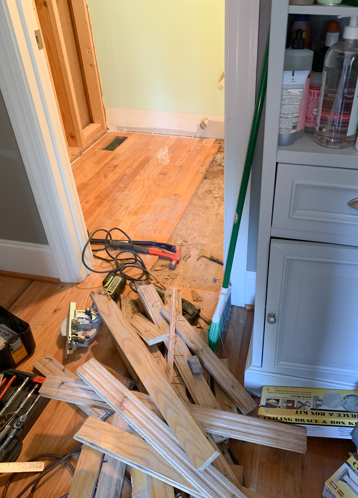 For those of you who have ever renovated a bathroom, you already noticed the water damage (NEVER, EVER PUT A WOOD FLOOR IN A BATHROOM). And you were already thinking, “I wonder if they have any extra plywood on hand for that subfloor because I bet it has rot.” And you’d be right.