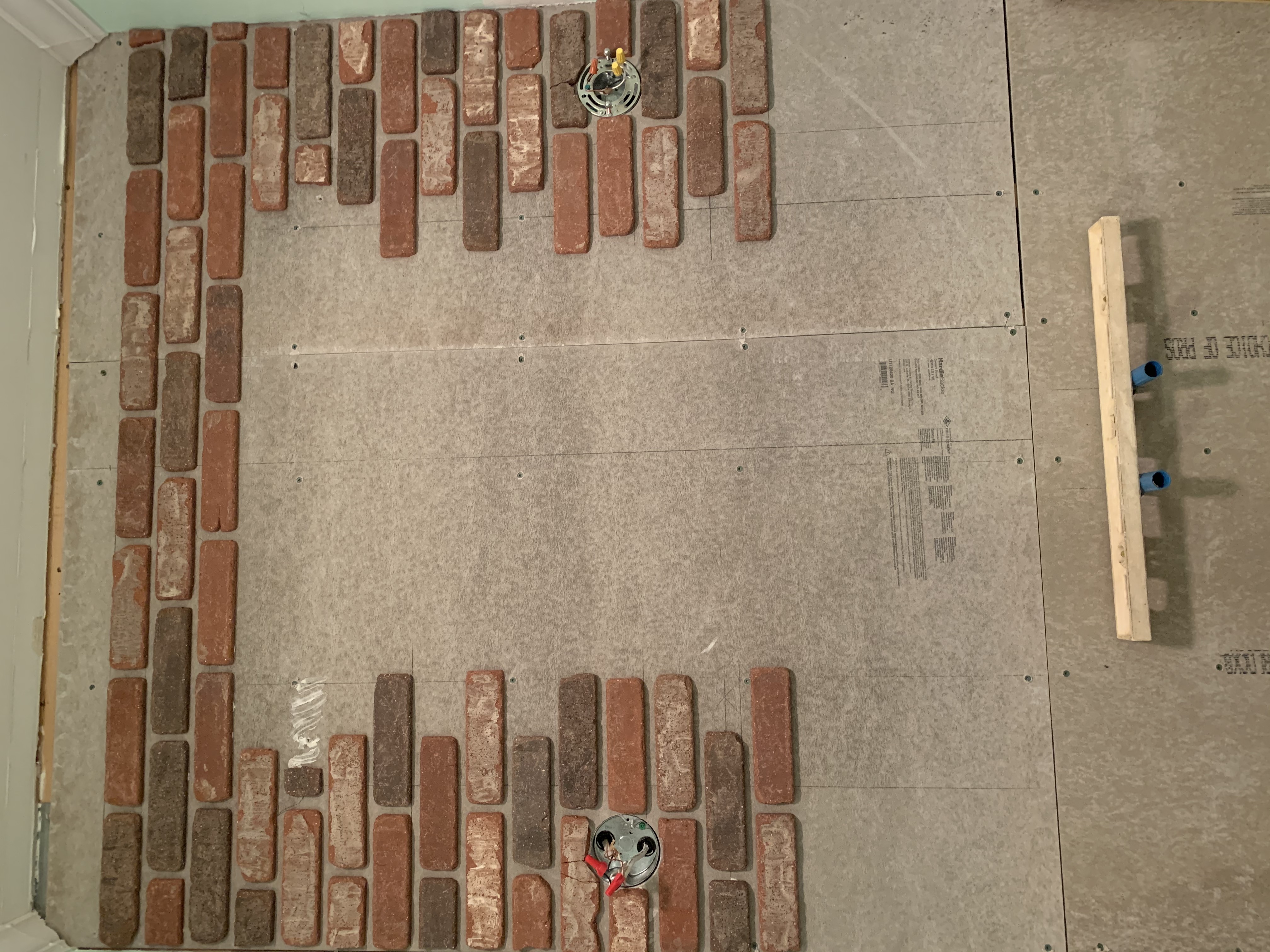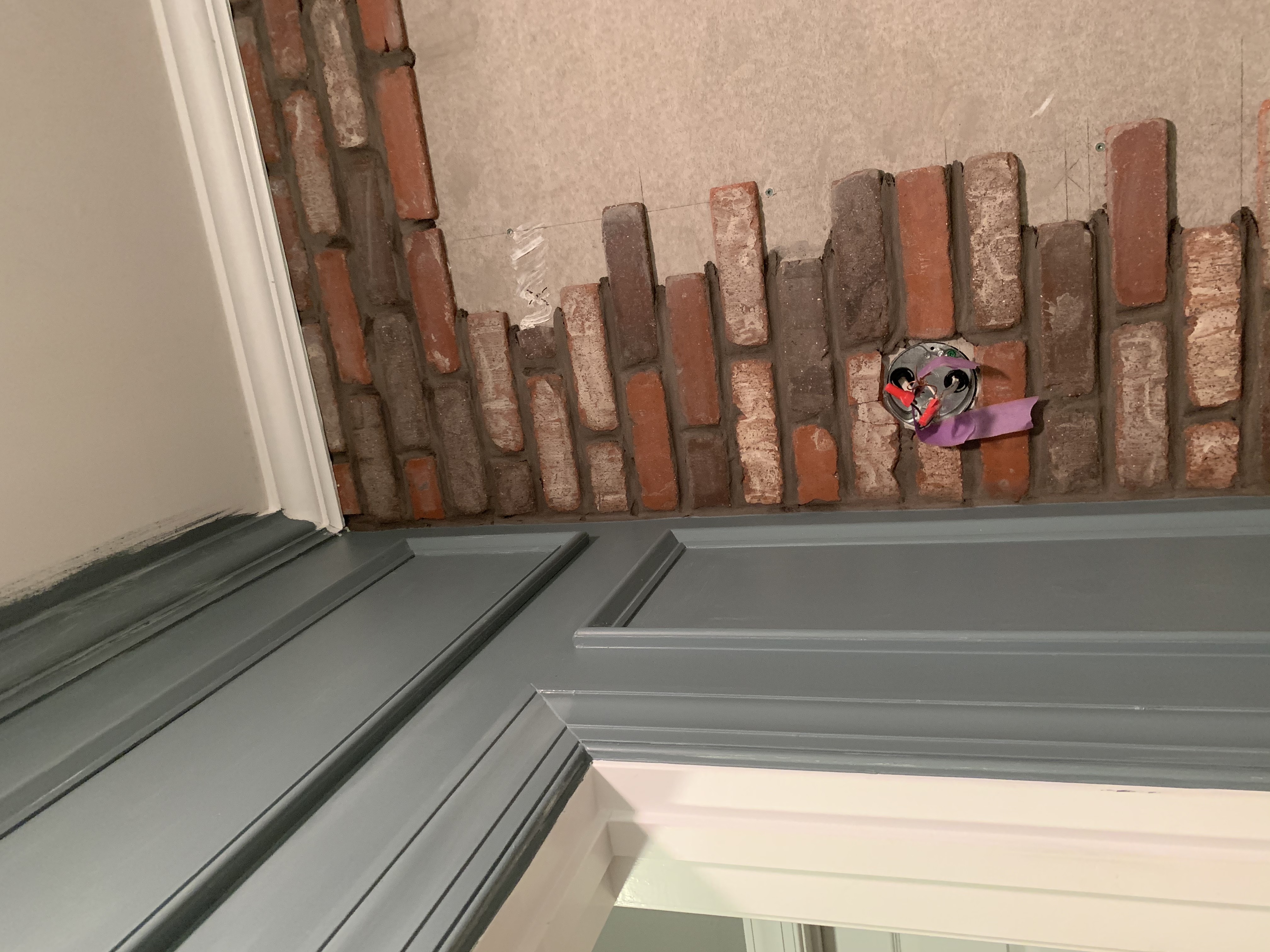 How about those awesome Veneer Bricks from Old Mill? This is the third time we’ve used these (the Castle Gate color) and they are absolutely FANTASTIC. They are 100% authentic brick, just thinner and easier to install. We went with a medium gray grout this time to achieve the antique look we were going for and I’m absolutely over the moon with how it turned out!