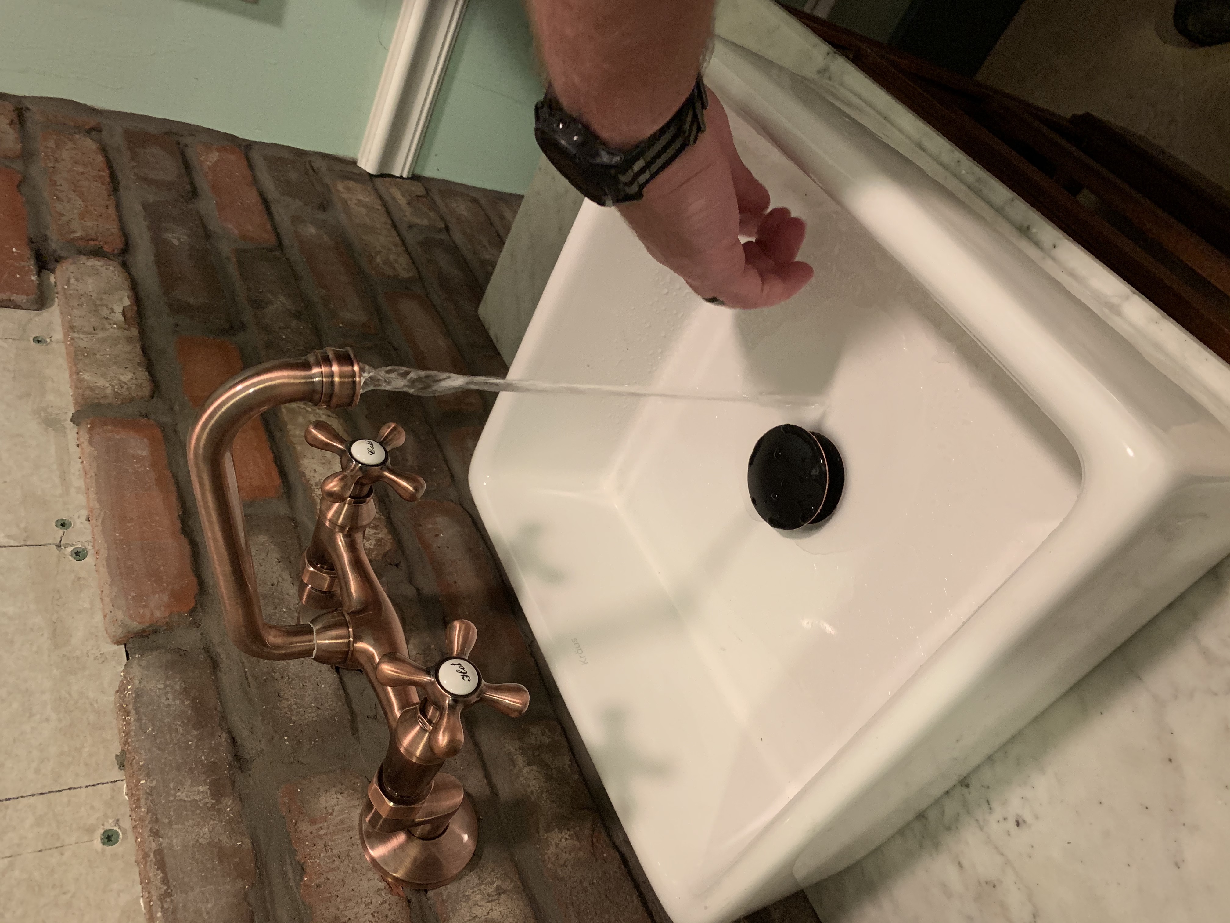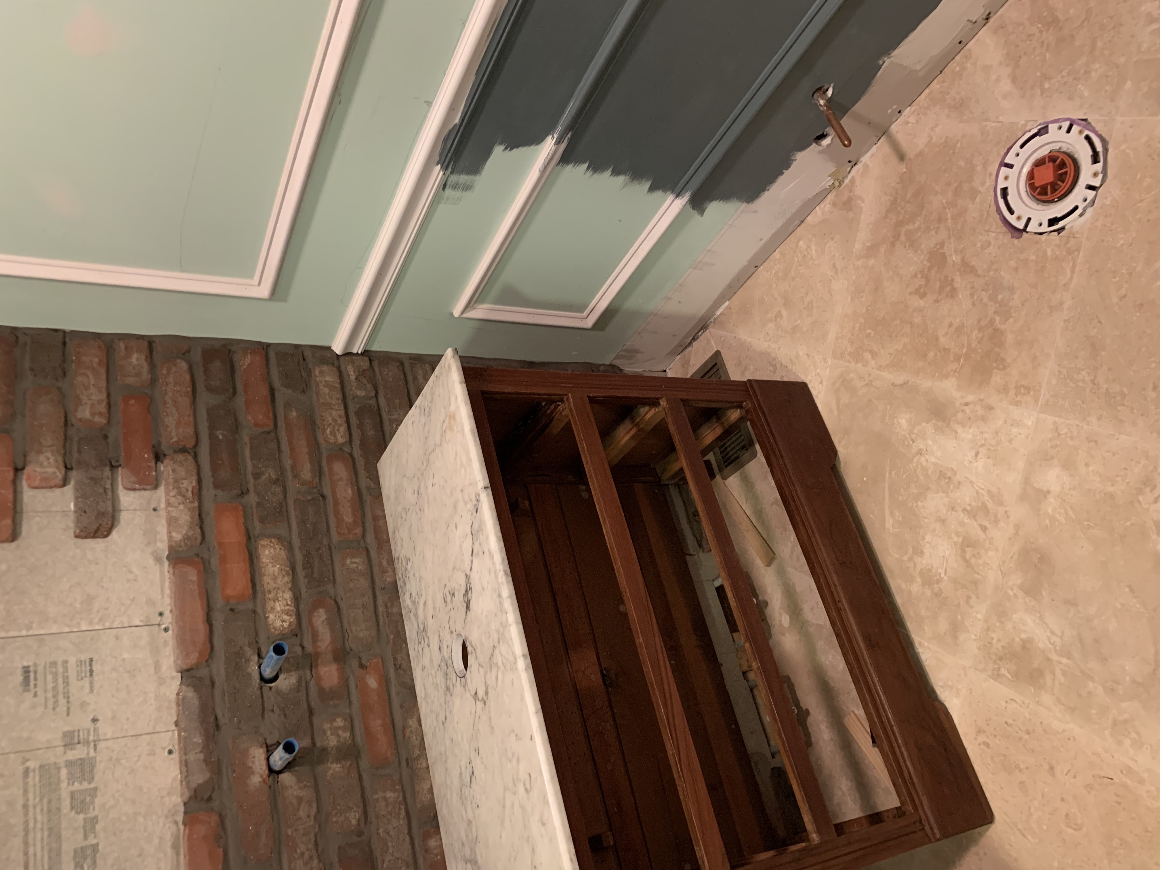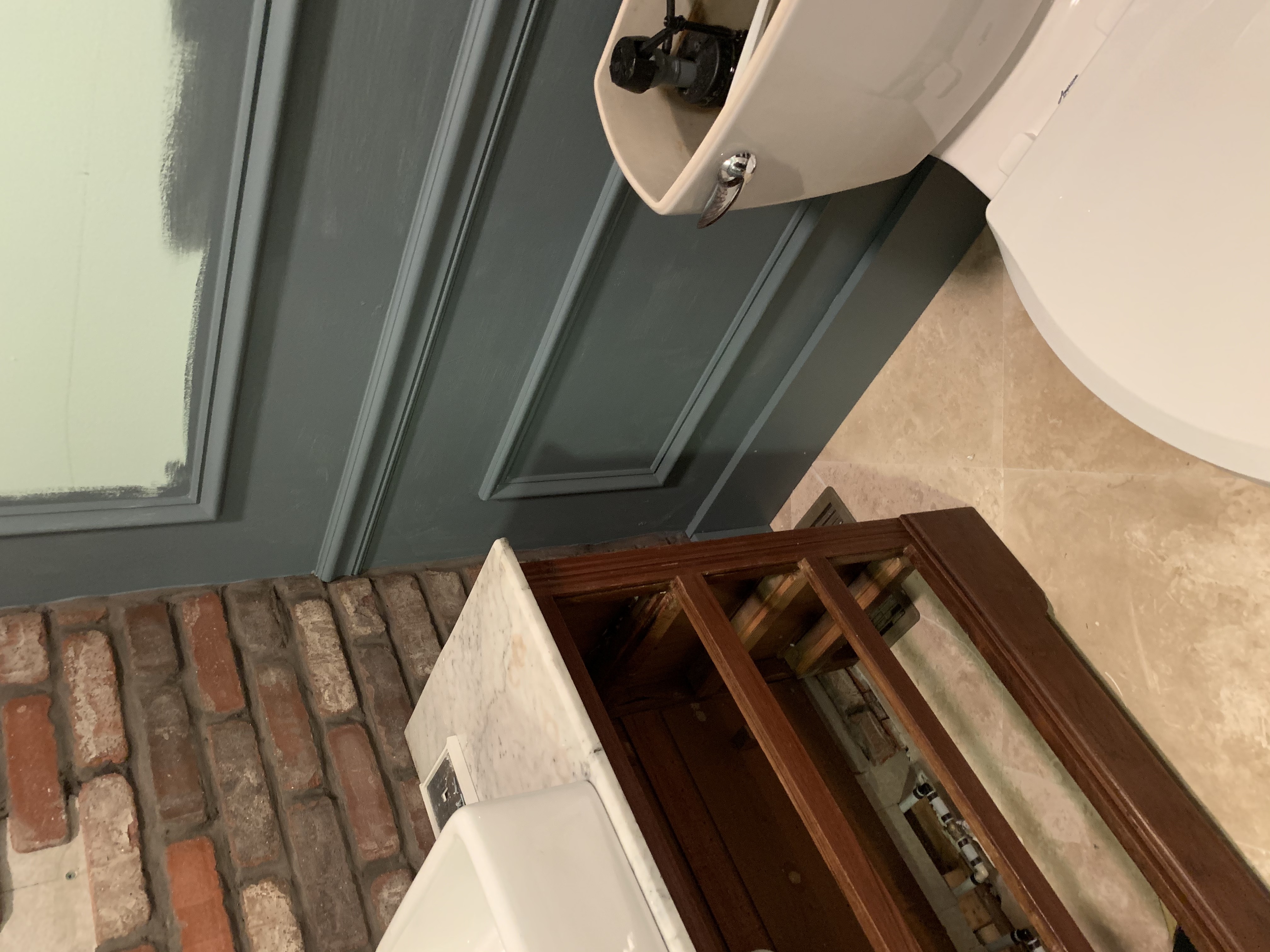 Remember Mr. “That Bathroom Doesn’t Need to Renovated” from next door? Well, as penance I asked him and his son to come over to help hang it. This involved he, his son, and my husband squeezed into this tiny bathroom, holding it up, and trying to line the bolts up with the holes we had dry fitted.
